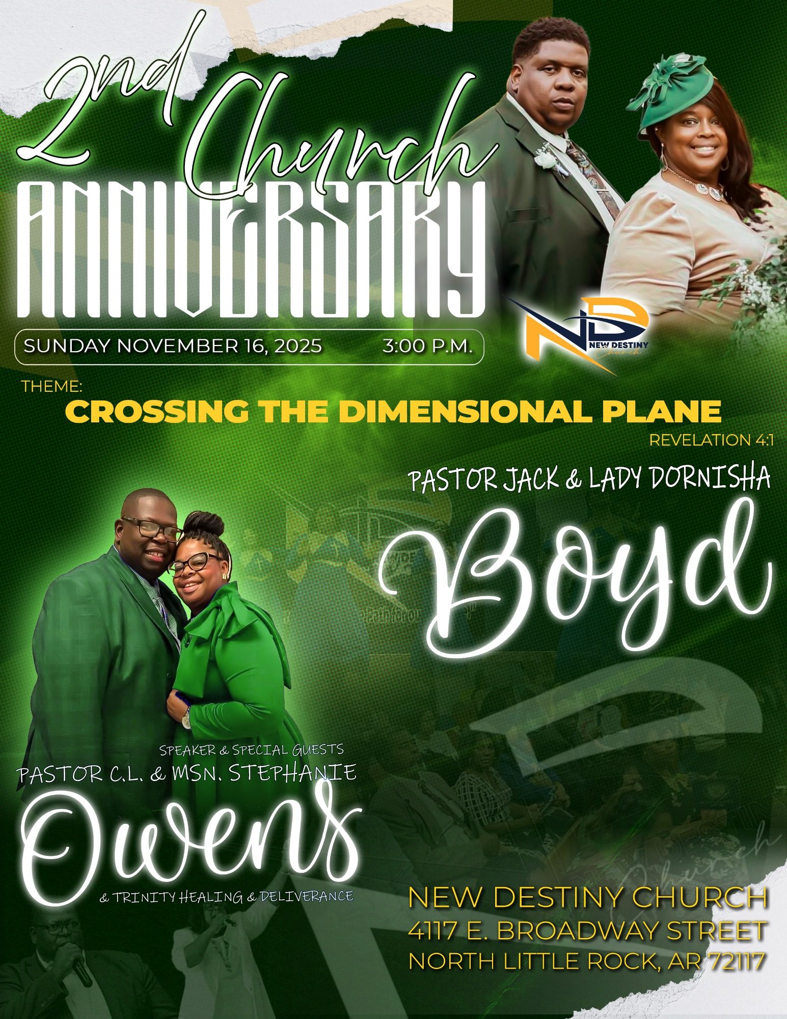 You are cordially invited to join New Destiny Church as we celebrate our 2nd Church Anniversary; two years of purpose, power, and promise!